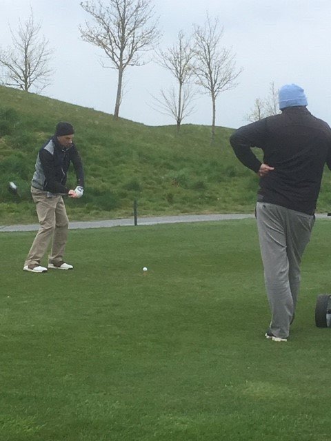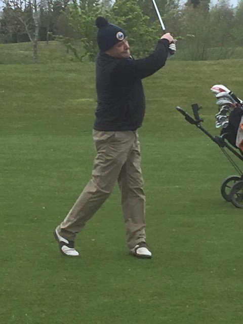 Pictured above Shane O’Neill teeing off on the tenth hole, Michael Landy on 14th watched by Colin Rayfus and also on 15th striking to the green.. Colin Rayfus on the 15th tee box and striking the last shot on the 17th to clinch the match.