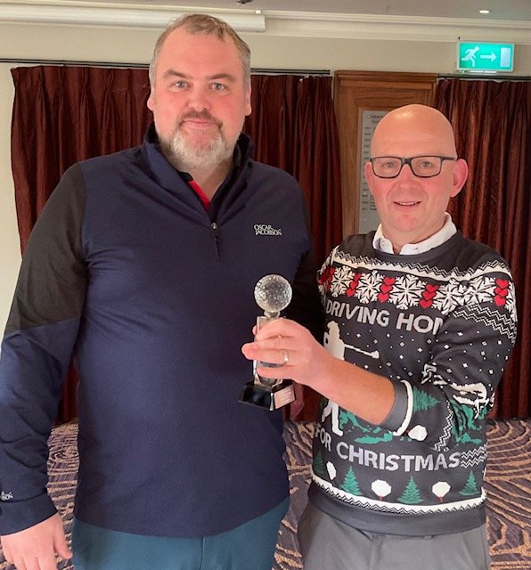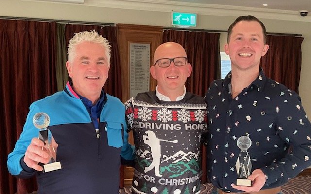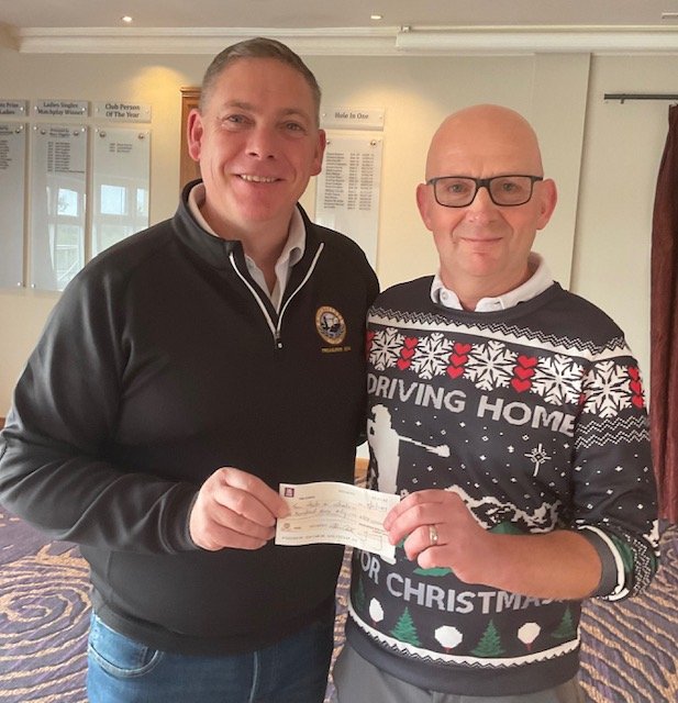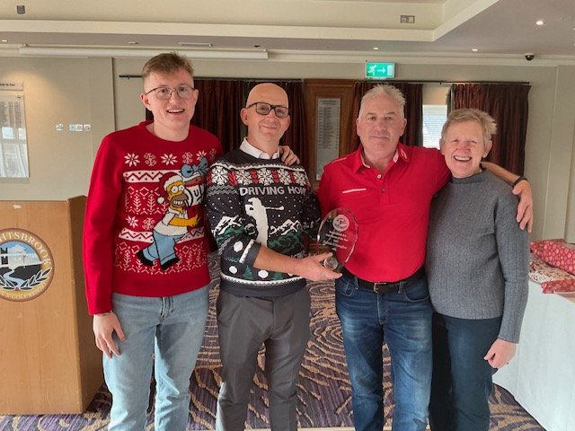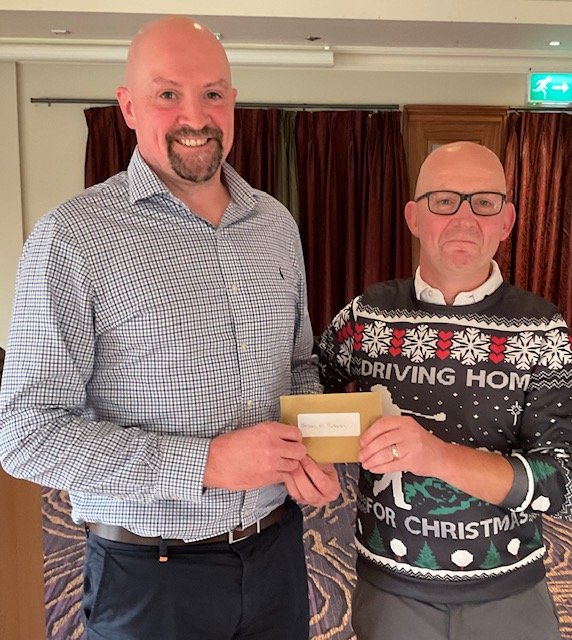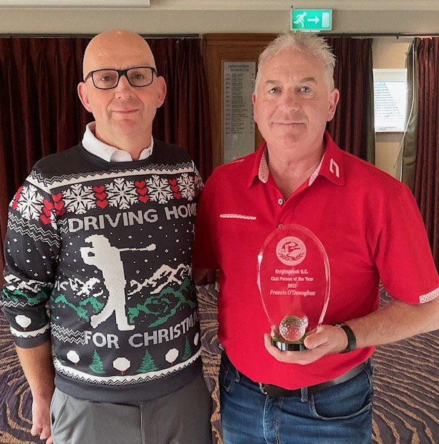 While the rain abated for most of the day, the wind was unrelenting as members took on the challenging conditions to play in the Knightsbrook Golf Club Annual Christmas Charity Day, dinner and presentations to celebrate the end of the golfing year. Captain Alan Codd presented the Club Person of the Year award to a shocked, Francis O Donoghue. The Treasurer, Owen Ganley presented a Cheque for €500, proceeds from a collection from members, to the Captain for Trim Meals on Wheels.