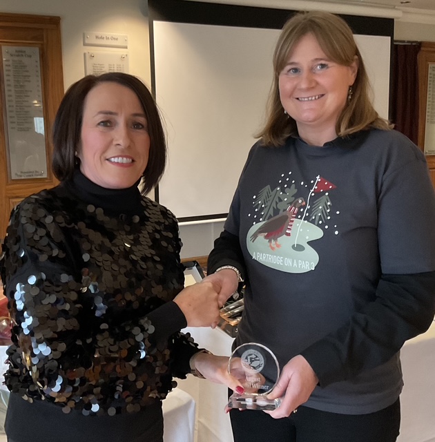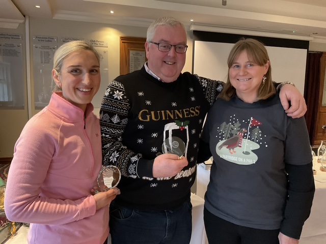 Josephine Patterson receives the newly named Liam McMenamin trophy from Anne McMenamin watched by Liam’s daughter Glenda. Knightsbrook Knights and Dames presented the trophy in memory of former Captain and President, Liam McMenamin who passed away in 2024.