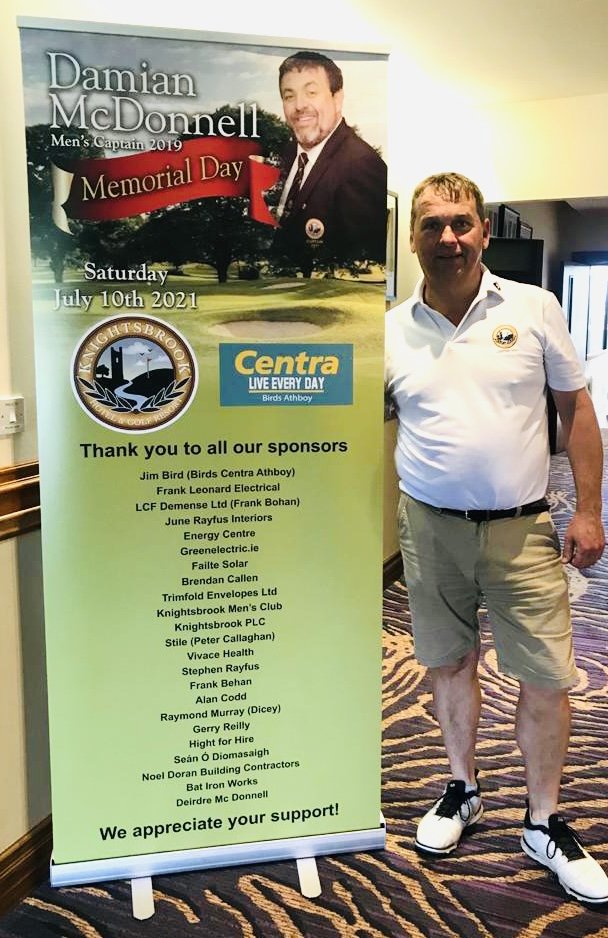 Acting president, Richard Wheeler standing beside the pop-up sign acknowledging the generous sponsorship for the Damian Mc Donnel Memorial Day, a testament to the high esteem in which our former captain was held. Richard has been the driving force on the committee promoting this important event and we wish him every success at the weekend. Two very worthy charities will benefit from the event, both close to the McDonnel family, Ennis VdeP and the Marie Keating Foundation.