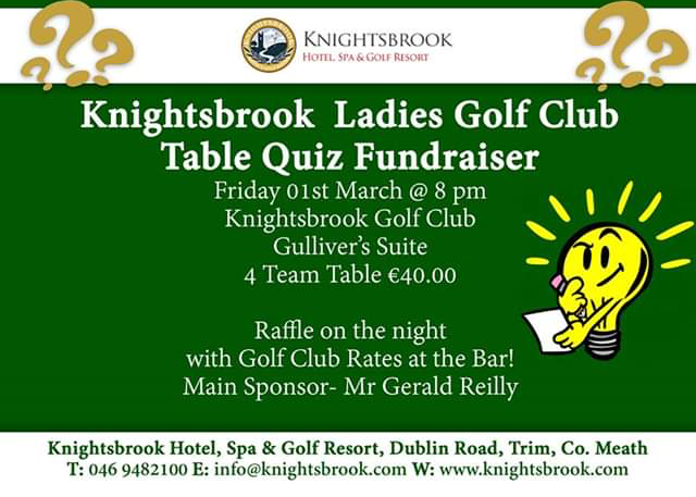 The Ladies’ Golf Club is organising a Table Quiz Fundraiser event in Knightsbrook on Friday, 1st March 2019 at 8.00 p.m. It should be a good night of fun and a chance for members to get together. Members and guests’are welcome. Tables €40 each.