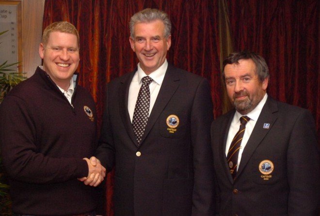 2014 Captain Gerry Ryan being congratulated by President Jonathan Cusack and 2013 Captain Frank Leonard