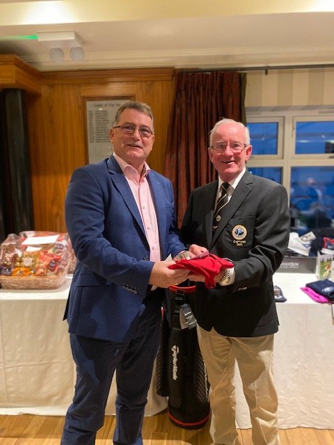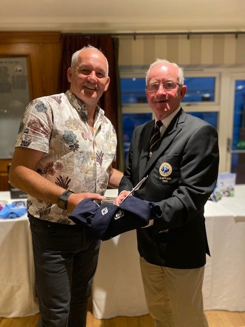 Michael Cunningham, winner of the inaugural Captain’s Prize to 5-day members receives his prize from Captain, Ger.